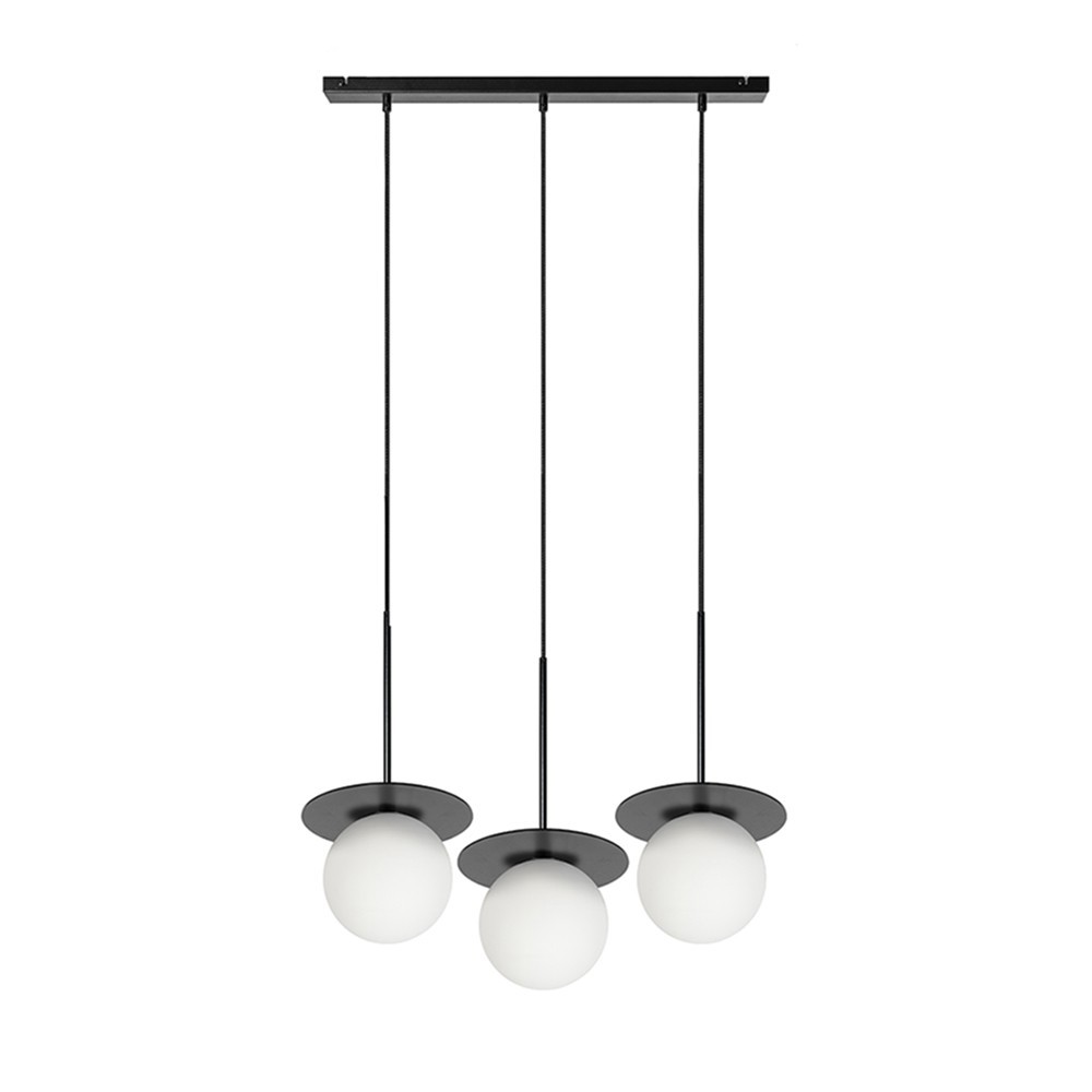 - lampada a sospensione a tripla barra - nero (Jet Black RAL 9005) - materiale metallo, vetro - lunghezza 60cm - larghezza 20cm - altezza 43cm - lunghezza totale 130cm - 3x diffusore in vetro bianco latte ⌀15cm - barra nera 60cm - 3x disco ⌀20cm - 3x cavo intrecciato, poliestere nero - filo G9 - max 3x12W LED - IP20