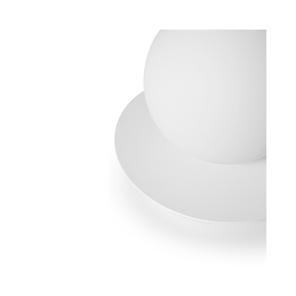 Il paralume sferico bianco latte, con un diametro di 15 cm, poggia su un disco di metallo verniciato a polvere, che riflette delicatamente la luce e conferisce alla lampada un carattere elegante e lussuoso. L'insieme è coronato da una base bassa con finitura strutturata, che aggiunge una leggerezza grafica alla lampada.