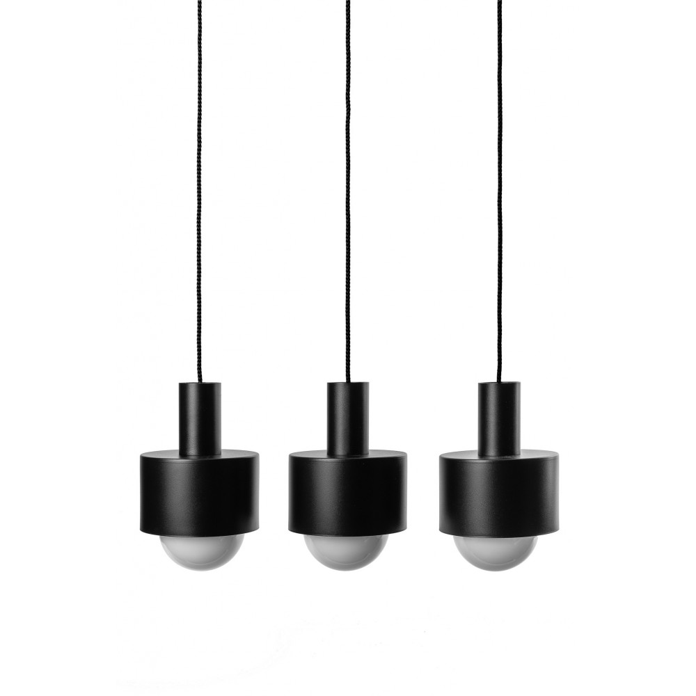 La lampada ENKEL 3L è composta da tre paralumi in metallo con un diametro di 17 cm, ciascuno verniciato a polvere in un colore nero intenso (Jet Black RAL 9005) con una finitura opaca e strutturata. Il tutto è sospeso da cavi tessili neri lunghi 107,5 cm, che consentono di regolare l'altezza della sospensione - da una forma compatta e poco ingombrante a una disposizione suggestiva e bassa.