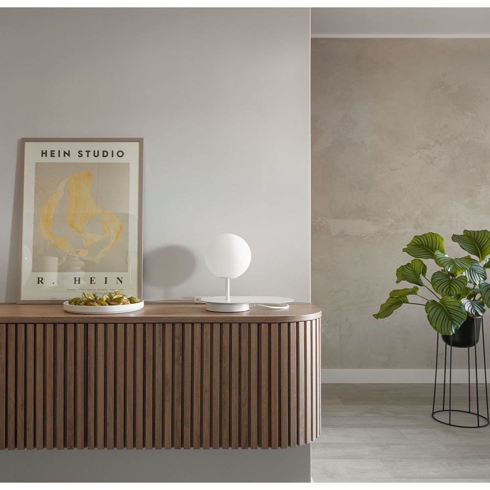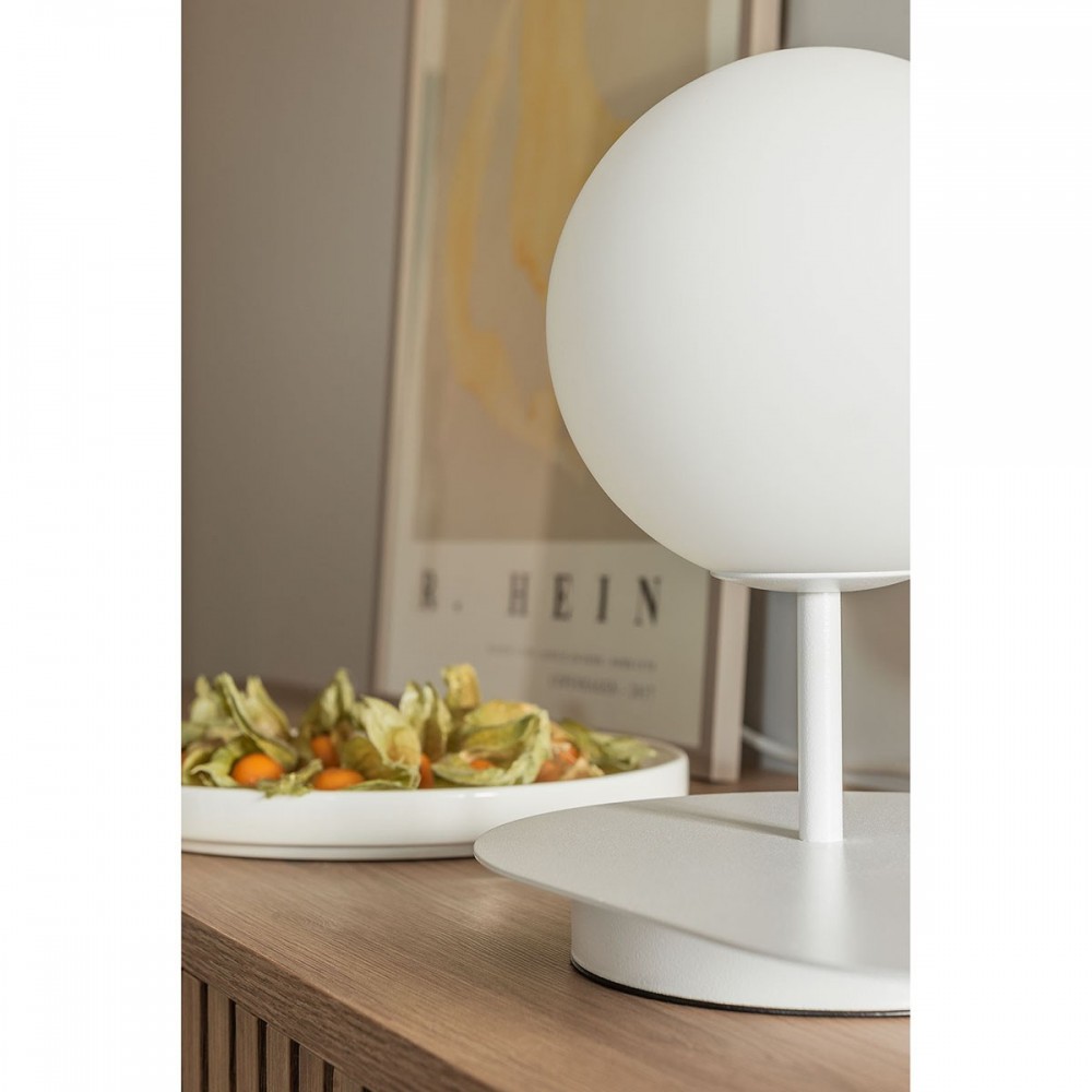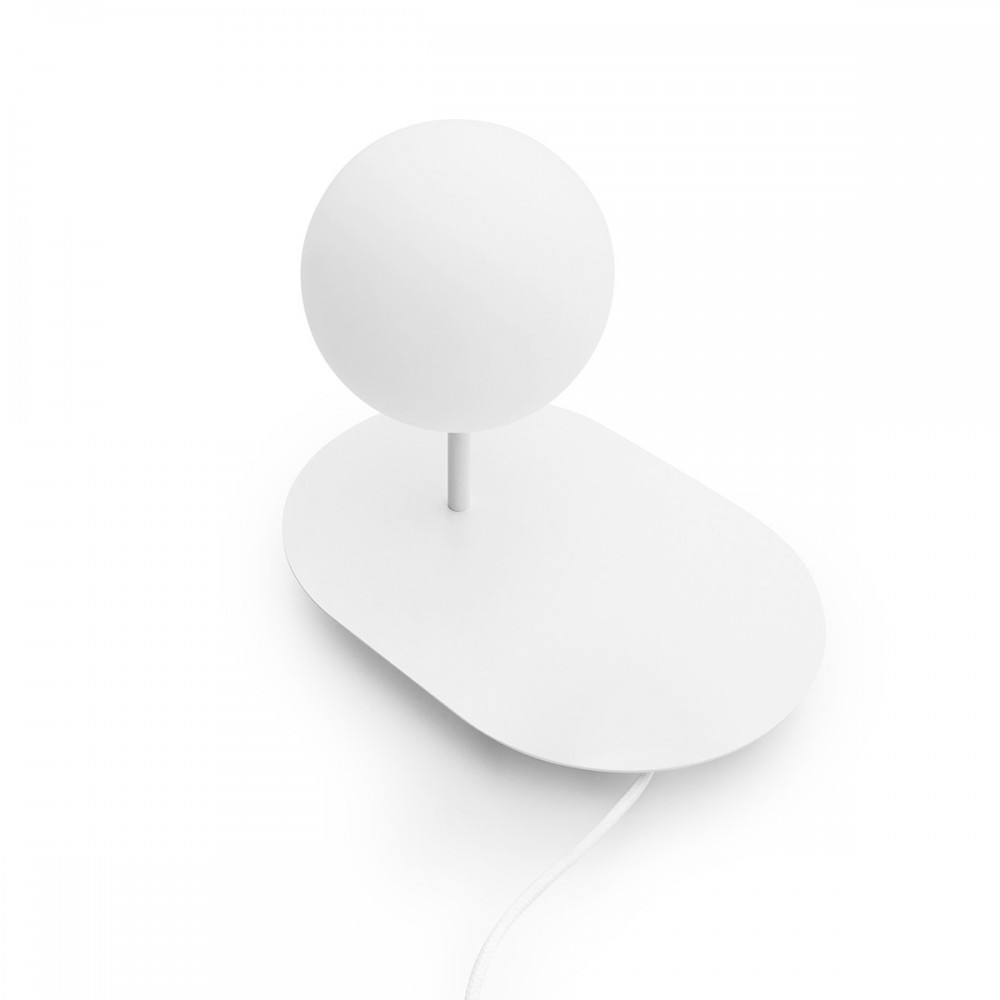- lampada da tavolo con ripiano - metallo / vetro - bianco - altezza 25cm - larghezza 30cm - globo in vetro bianco opaco fi 15cm - base strutturata bianca fi 14cm - ripiano in metallo bianco - 2 X 0,75mm2 cavo bipolare in treccia di poliestere bianco, lungo 150cm - spina e interruttore bianchi - filo G9 - max 12W