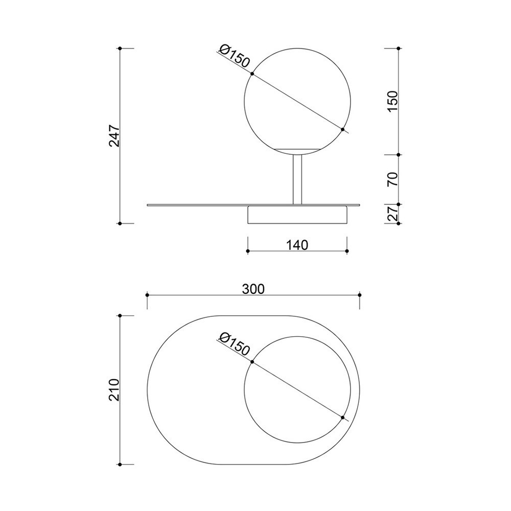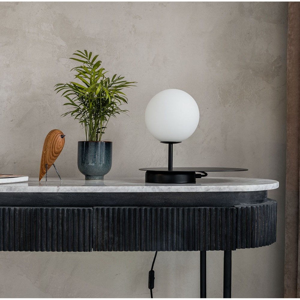 - lampada da tavolo con ripiano - metallo/vetro - nero - altezza 25cm - larghezza 30cm - diffusore in vetro bianco opaco fi 15cm - base strutturale nera fi 14cm - ripiano in metallo nero - 2 X 0,75mm2 cavo intrecciato in poliestere nero lungo 150cm - spina e interruttore neri - filo G9 - max 12W.