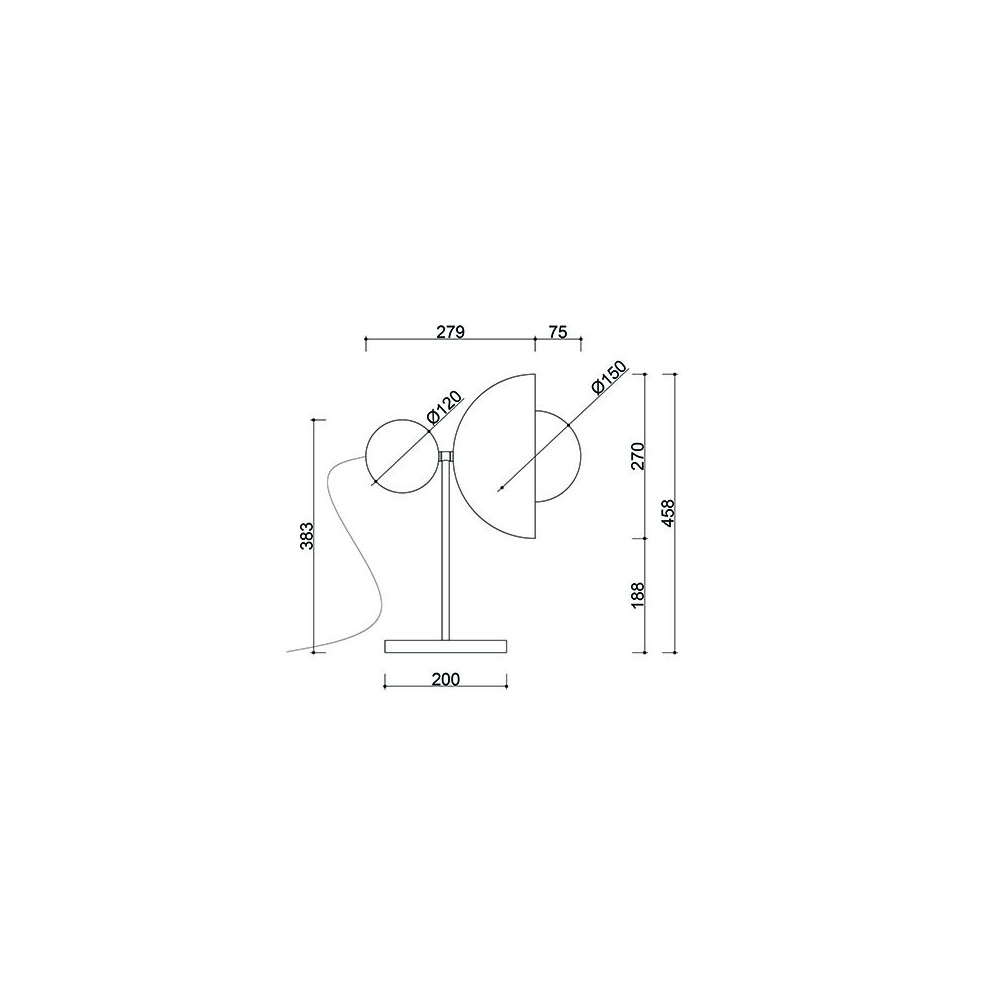 La lampada è alta 45,8 cm e larga 35,4 cm. Una robusta base in metallo (⌀20 cm) sostiene un'esile struttura sulla quale sono collocati un paralume semisferico in metallo, una sfera in legno di frassino e un paralume in vetro bianco del diametro di 15 cm. Il cavo intrecciato in poliestere, lungo 150 cm, è in tinta con l'insieme.