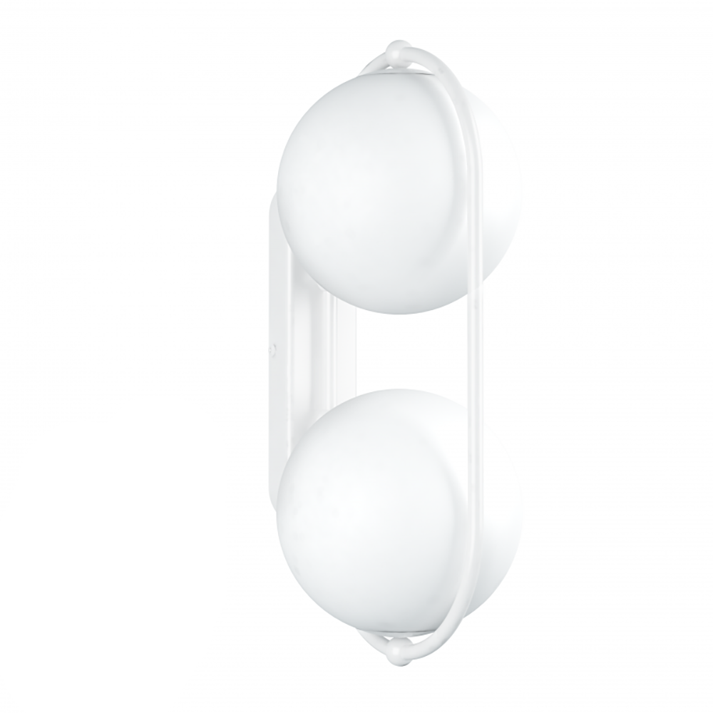 La lampada è realizzata in metallo e vetro. La struttura e la cornice a parete sono rivestite con una verniciatura a polvere strutturata opaca, che ne sottolinea il carattere moderno e durevole. I due paralumi in vetro bianco latte con un diametro di 15 cm emettono una luce morbida e uniforme. All'interno sono presenti due supporti G9, adatti a sorgenti LED fino a 12W ciascuna.