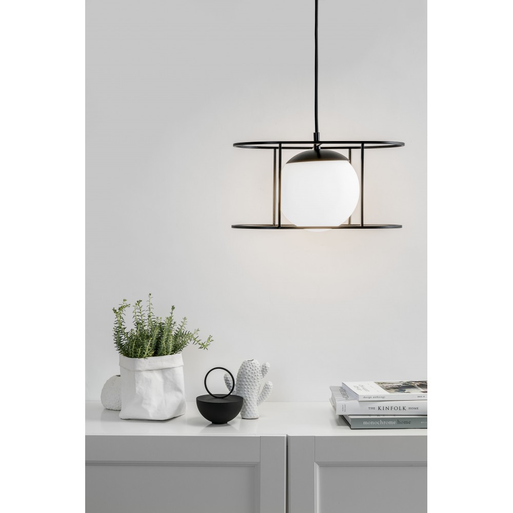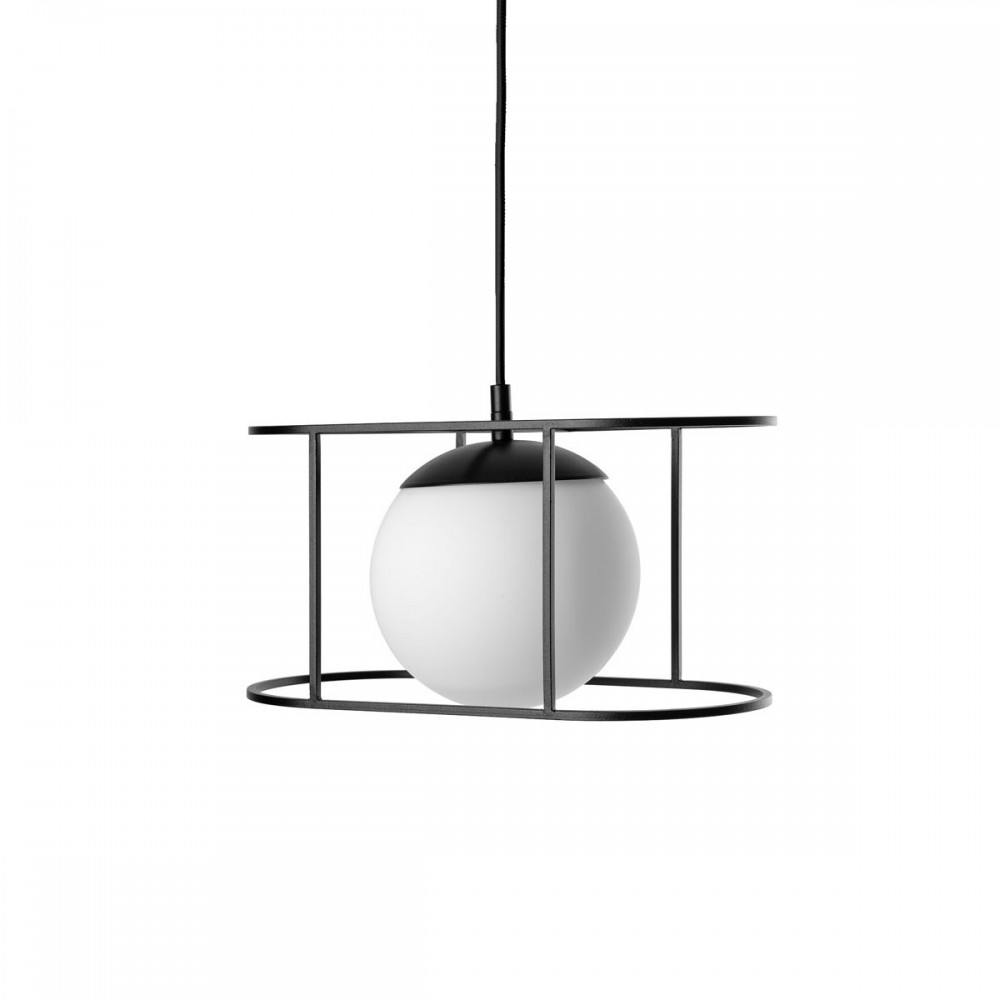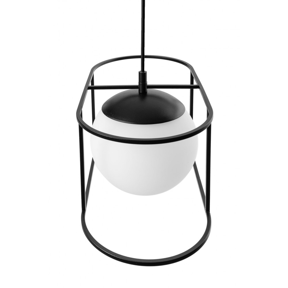 - lampada a soffitto, lampada a sospensione - lunghezza 123 cm - diffusore in vetro bianco smerigliato - montatura in metallo e lunetta a soffitto laccati in nero strutturale - treccia di cotone nero - cavo a 2 conduttori 2 X 0,75mm2 - max 15W - IP44.