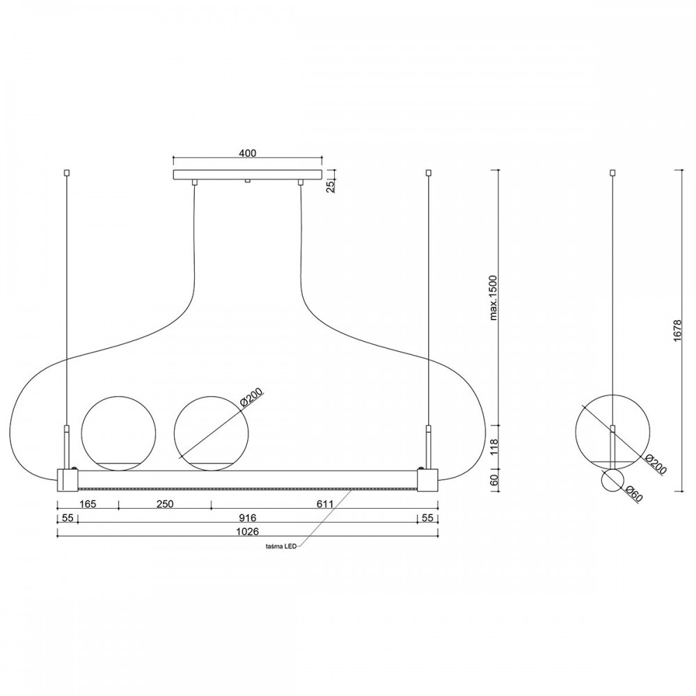 - Due paralumi sferici in vetro lattiginoso (ø20 cm) + striscia LED integrata da 25W.