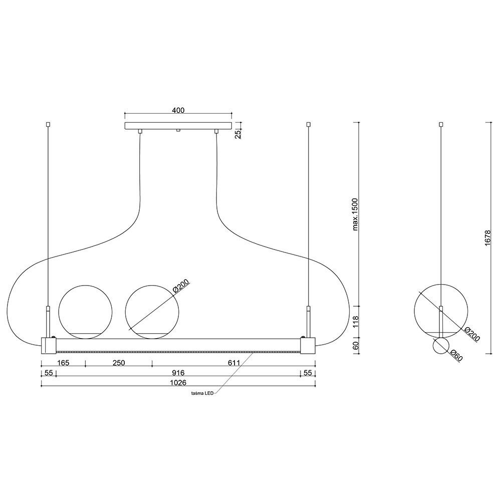 - Due paralumi sferici in vetro lattiginoso (ø20 cm) + striscia LED integrata da 25W.