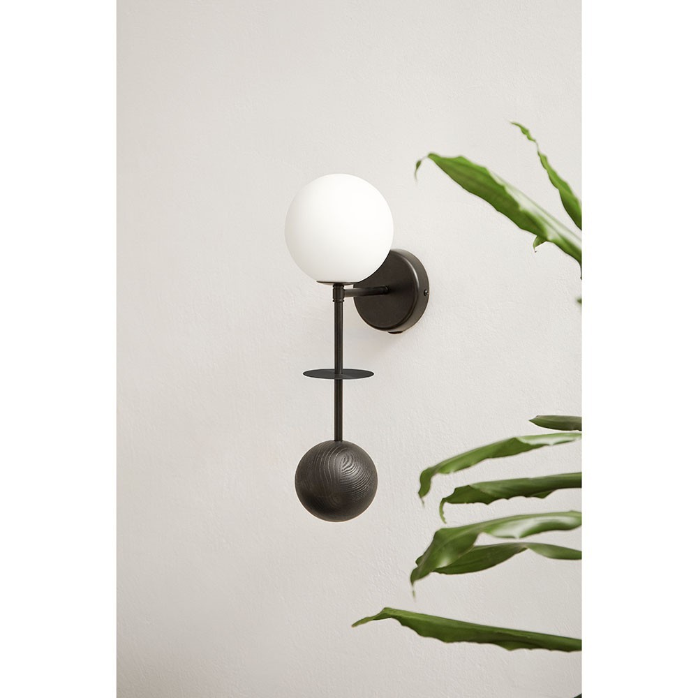 -lampada da parete, applique - nero, bianco - materiale metallo, legno, vetro - altezza 50cm - larghezza 15cm - profondità 22cm - diffusore in vetro bianco ⌀15cm - elemento in metallo ⌀10cm - sfera bugnata ⌀12cm - copertura in metallo nero ⌀12cm - attacco G9 - max 12W - IP20