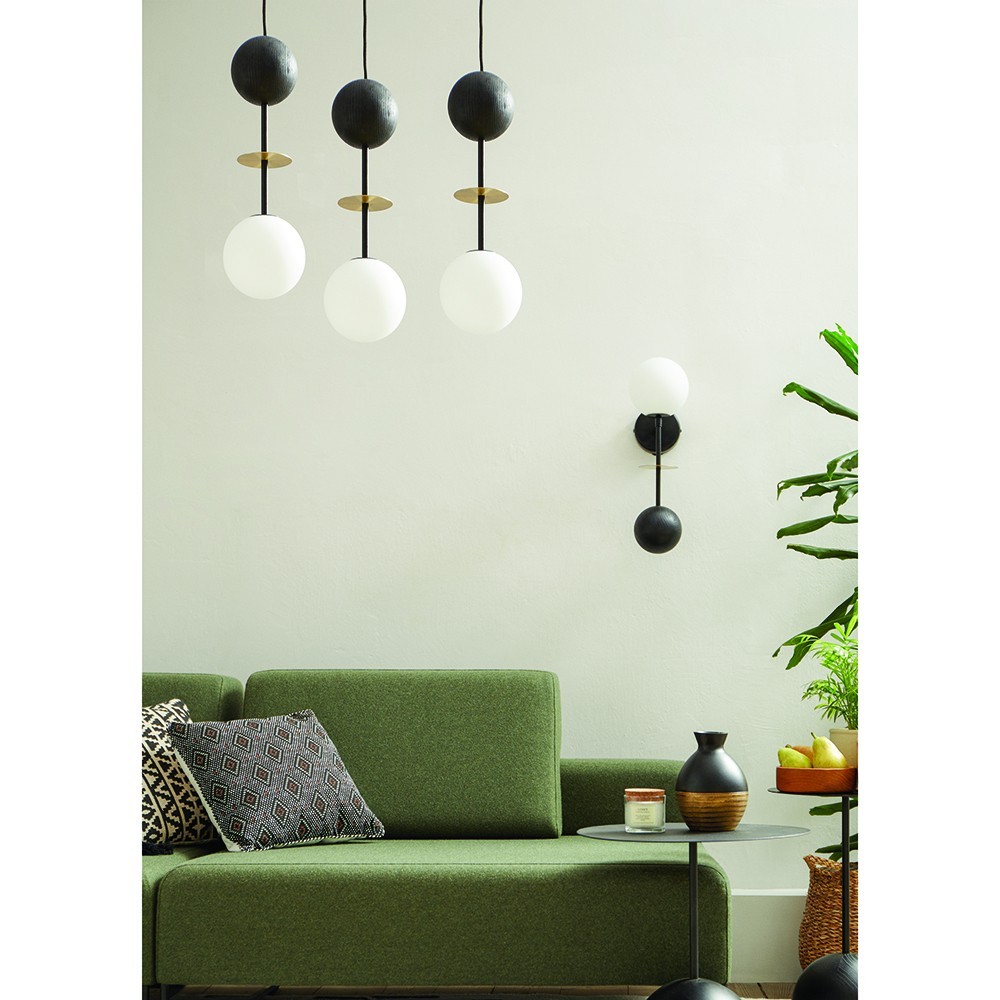 - lampada a sospensione, plafond - colore nero, ottone - materiale metallo, legno, ottone, vetro - altezza 160cm - larghezza 30cm - 3x diffusore in vetro bianco ⌀15cm - 3x elemento in ottone ⌀10cm - 3x sfera in frassino ⌀12cm - cavo intrecciato in poliestere nero73cm, 93cm, 113cm - supporto a soffitto in metallo nero ⌀30cm - filettatura G9 - max 3x12W - ...