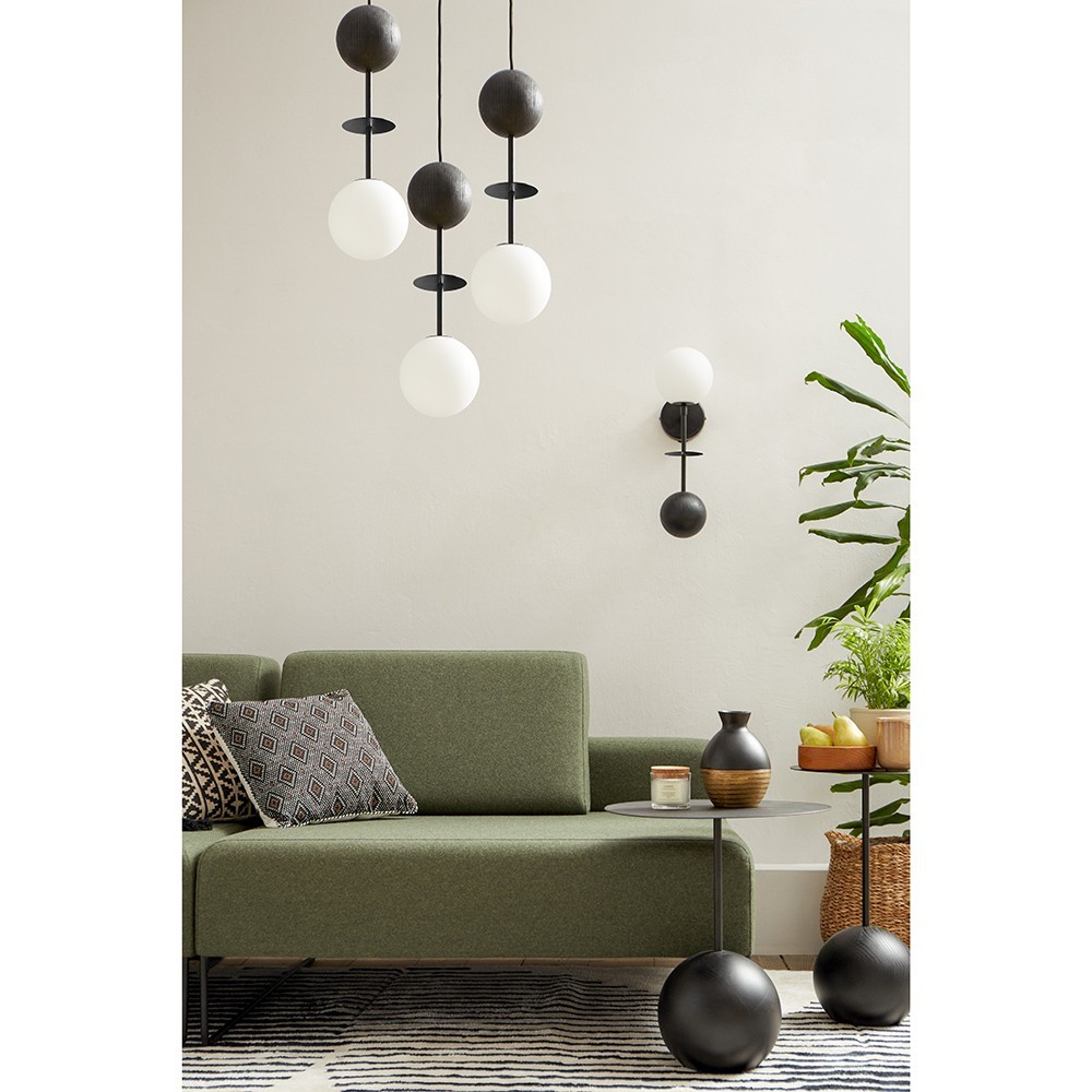 - lampada a sospensione, plafond - colore nero - materiale metallo, legno, vetro - altezza 160cm - larghezza 30cm - 3x diffusore in vetro bianco ⌀15cm - 3x elemento in metallo ⌀10cm - 3x globo bugnato ⌀12cm - cavo intrecciato in poliestere nero73cm, 93cm, 113cm - supporto a soffitto in metallo nero ⌀30cm - filo G9 - max 3x12W - ...