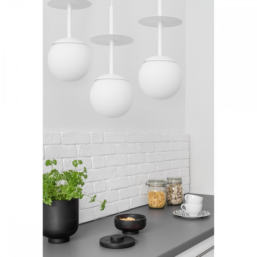 - tripla lampada a soffitto a sospensione - metallo / vetro - bianco - lunghezza 130cm - lunghezza cavo 70cm, 80cm, 70cm - diffusore in vetro bianco opaco fi 20cm - barra a soffitto strutturale laccata bianca 60cm - tre dischi in metallo fi 20cm - cavo bipolare 2 X 0,75mm2 in treccia di poliestere bianco - filo E27 - max 3x15W