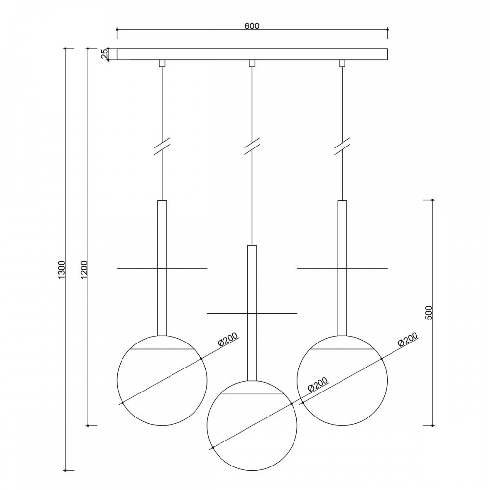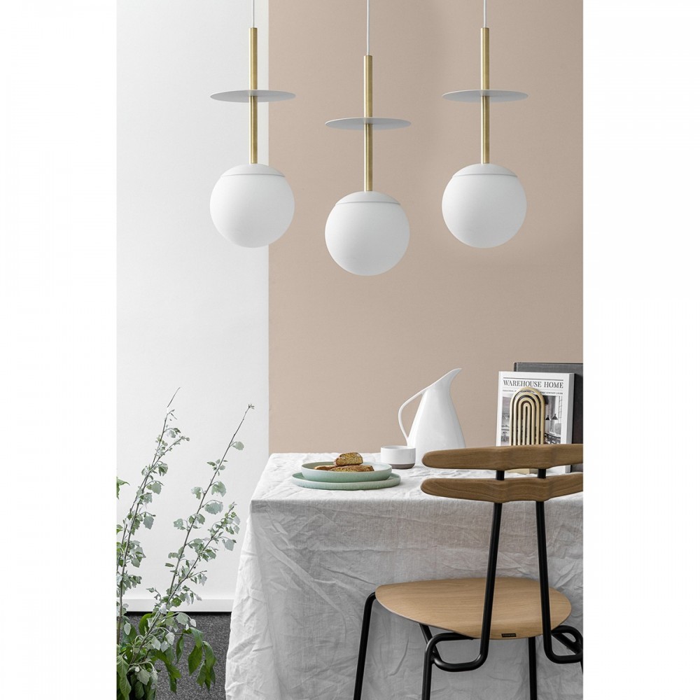 - tripla lampada a soffitto a sospensione - metallo / vetro - bianco - lunghezza 130cm - lunghezza cavo 70cm, 80cm, 70cm - diffusore in vetro bianco opaco fi 20cm - barra a soffitto strutturale laccata bianca 60cm - tre dischi in metallo fi 20cm - cavo bipolare 2 X 0,75mm2 in treccia di poliestere bianco - filo E27 - max 3x15W