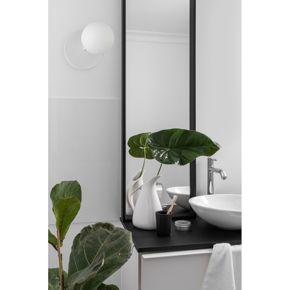 - lampada da parete / supporto a parete - metallo / vetro - bianco - altezza 24cm - larghezza 20cm - profondità 18cm - diffusore in vetro di 15cm di diametro in bianco opaco - supporto a parete verniciato in bianco strutturale - cavo bipolare 2 X 0,75mm2 - filettatura G9 - max. 12W - IP44