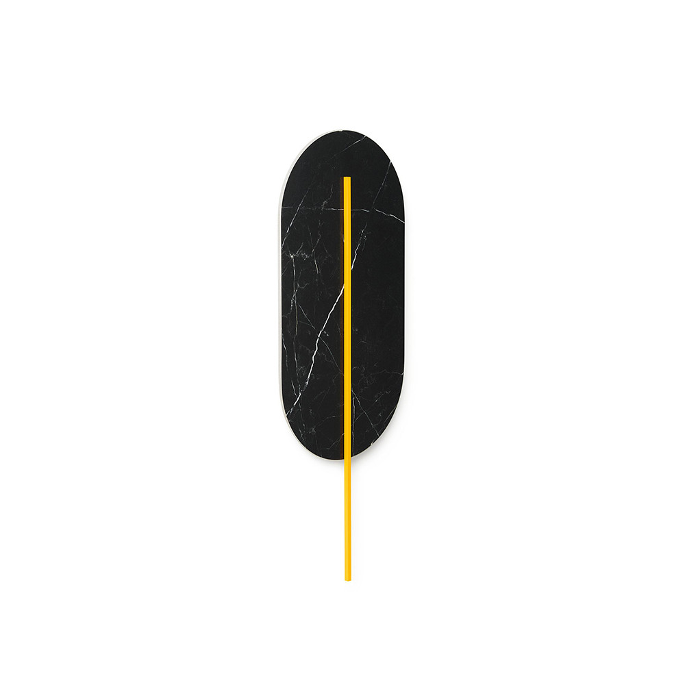 -lampada da parete, applique - colore del gres nero (Desire Black Gres) - colore dell'asta a scelta: bianco, nero, melone, ottone - materiale: metallo, ottone, gres smaltato - lunghezza 3,8cm - larghezza 21cm - altezza 56,6cm - paralume con elemento in ottone (fissato con magneti alla staffa a muro) - staffa in metallo bianco 8x8cm - filettatura 2xG9 - max 2x12W - IP20