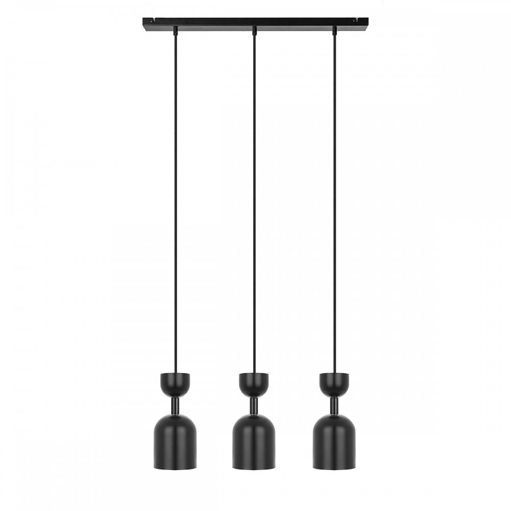 -lampada a sospensione tripla -metallo - nero - lunghezza lampada 130cm- larghezza 60cm - paralume 3x in metallo nero strutturale fi 11cm - rivestimento del soffitto verniciato in nero strutturale 60cm - cavo bipolare 2 X 0,75mm2 in treccia di poliestere nero - lunghezza 100cm - filo GU10 - max 3x10W